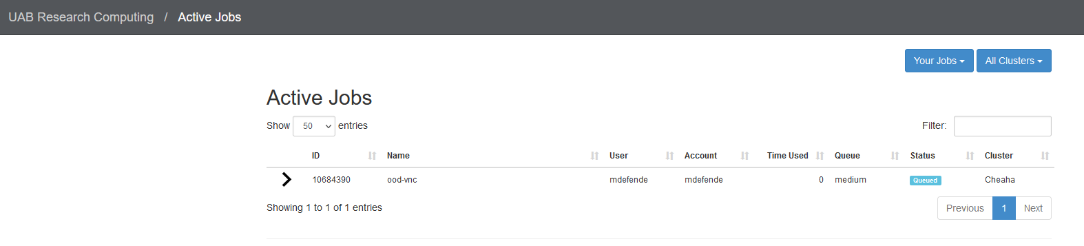There are fields such as job ID, job name, time spent active, and the queue or partition. You can sort your job list by any of these fields and can filter for specific jobs using the Filter option at the top right.