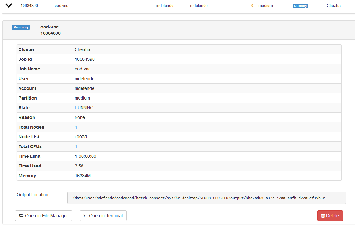 This table shows extra information such as the total number of nodes, CPUs, time limit, and memory requested for the job. The path to the output file for the job created by Slurm will also be listed. You can open the file location in a file browser or in a terminal here.