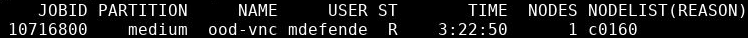 By default the fields displayed are jobid, partition, jobname as name, blazerid as user, job state as st, total run time as time, number of nodes as node, and the list of nodes as nodelist, used for each job a researcher has submitted.