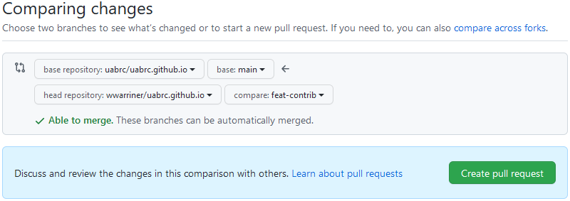 uabrc/uabrc.github.ioandmainby default. Be sure that they do. - In the third drop-down menu, select your fork.