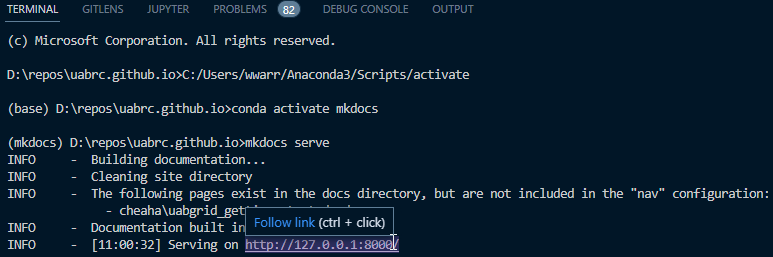 To build the documentation locally, use mkdocs build in the VSCode terminal. Be sure to fix all warnings before submitting a pull request.