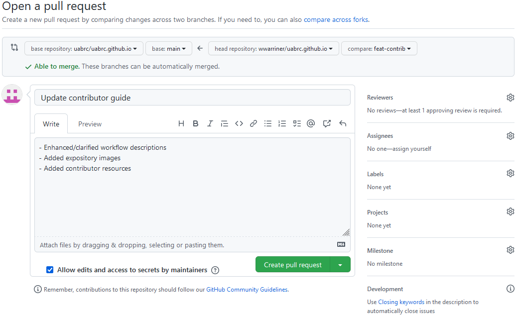 - If you want reviewers to be able to make changes to your pull request (recommended) then leave the "Allow edits" checkbox checked.