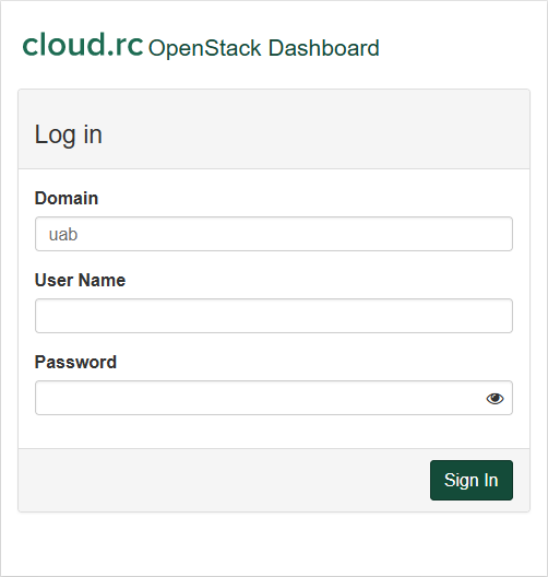 To get started using cloud.rc, please navigate to https://dashboard.cloud.rc.uab.edu/. You will be taken to a login page that looks like below. To login you will need an account, please request one by contacting Support. When requesting an account, please tell us how you intend to use the service. Some reasonable use-cases are listed in Cloud Usage Philosophy below.