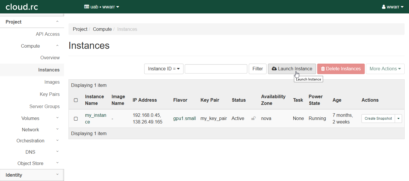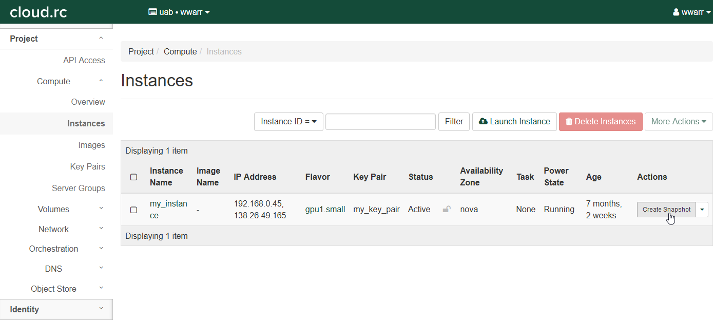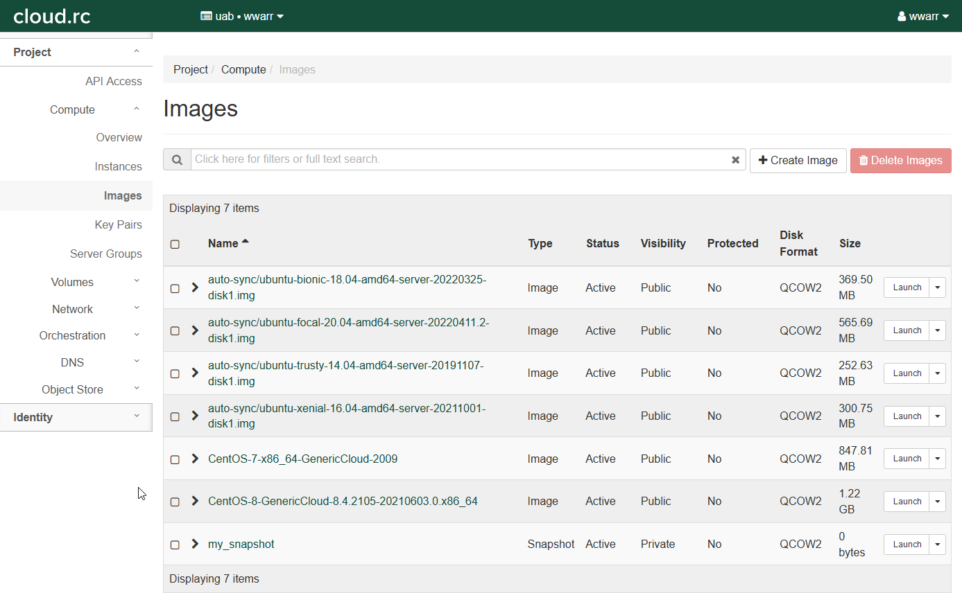 Images are a helpful way to store the state of an instance for later use. Repeating tedious tasks like Software Installs can be avoided by taking a snapshot at a known-good point during set up of an instance environment, saving time in the future if something goes wrong. Images may also be shared with other users to simplify workflows and onboarding new collaborators. To create an image please follow the steps below. We assume you are already logged in at cloud.rc