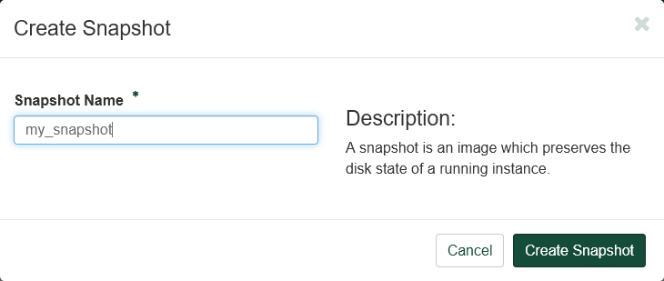 A dialog box will open. Fill in the "Snapshot Name" with a memorable name suitable for future reference, then click "Create Snapshot". See Naming Conventions.