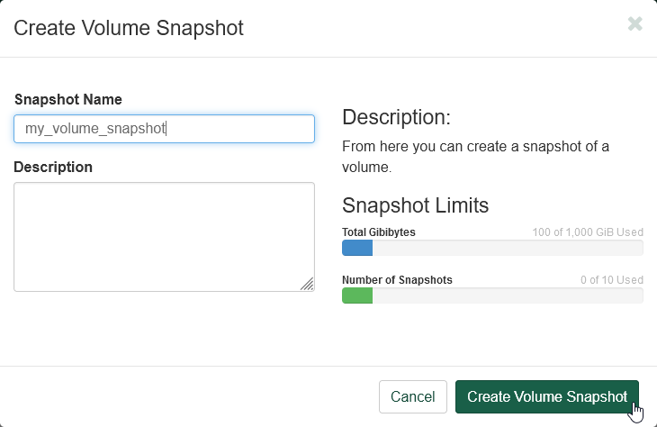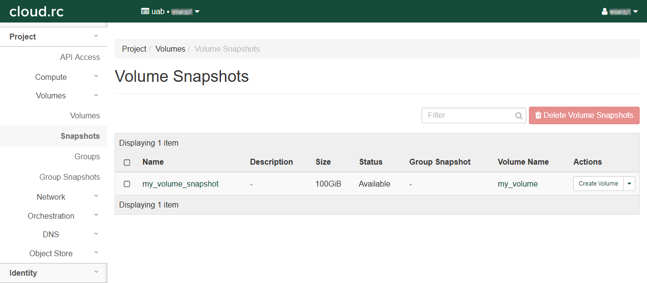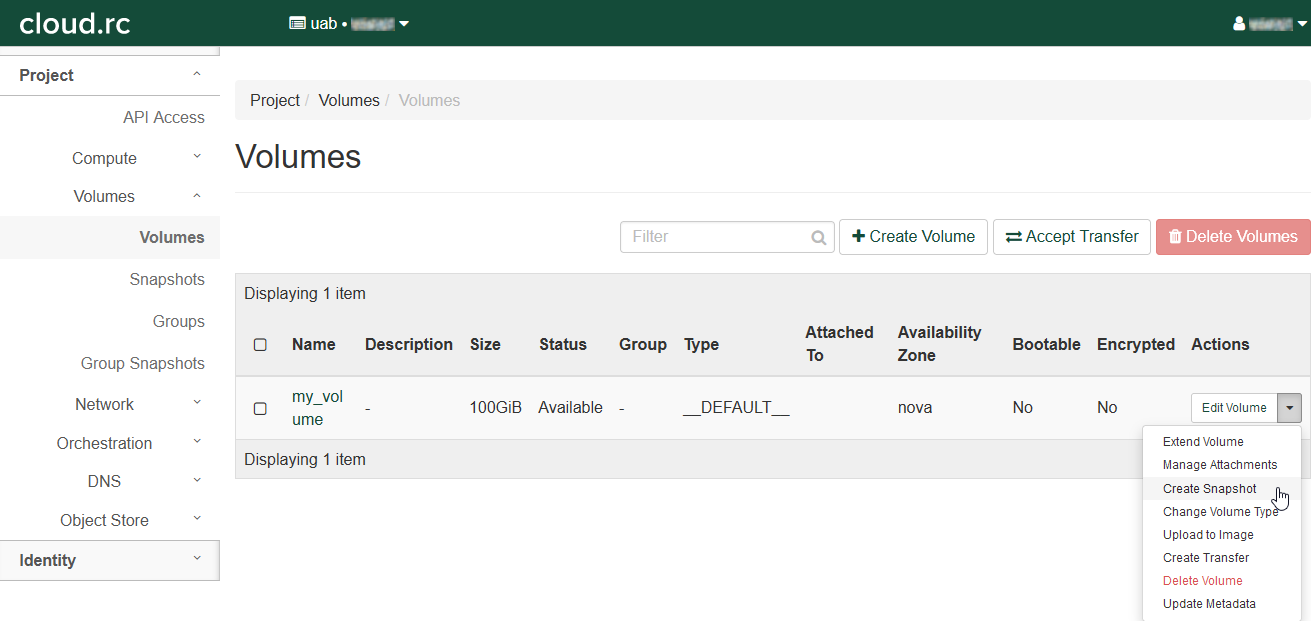 Volume snapshots are a helpful way to store the state of a volume for later use. They are used as the backing for Images, or Instance Snapshots, and have the same benefits. Most volume snapshots are created as part of an instance, but to create a volume snapshot directly please follow the steps below. We assume you are already logged in at cloud.rc