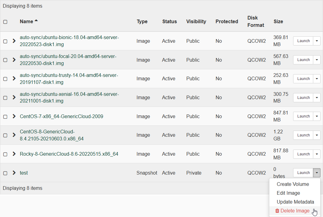 Notice the image has a size of zero bytes, which is expected and does not affect the ability to create instances. Images are a convenience pointer to the underlying volume snapshot, so they have no size themselves. The underlying volume snapshot does have a fixed size. To see the size of the underlying volume snapshot, click "Volumes" and then "Snapshots" in the left hand navigation menu.