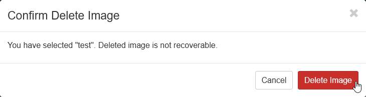 To delete an image, return to the "Images" page using the left-hand navigation pane. In the table, find the row with the image you wish to delete, and click the drop-down arrow under "Actions" in that row. Then click "Delete Image" to open a confirmation dialog.