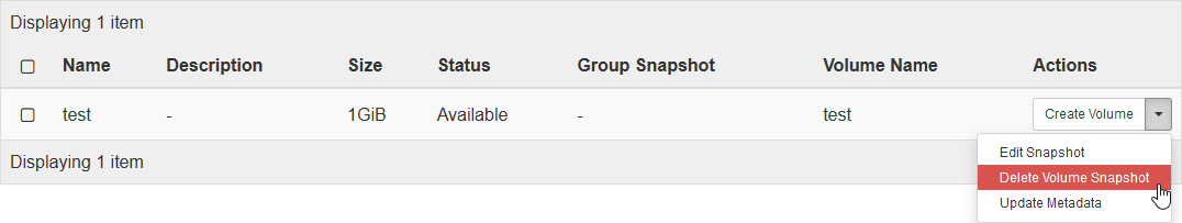 To delete a volume snapshot, return to the "Volume Snapshots" page using the left-hand navigation pane. In the table, find the row with the volume snapshot you wish to delete, and click the drop-down arrow under "Actions" in that row. Then click "Delete Volume Snapshot" to open a confirmation dialog.