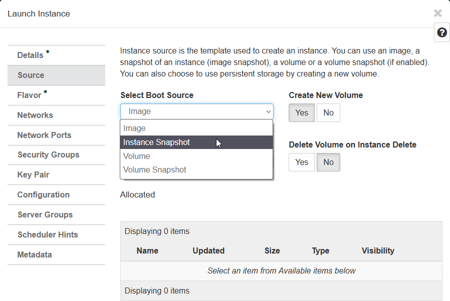 In the "Source" tab, select "Instance Snapshot" under the "Select Boot Source" drop down menu.