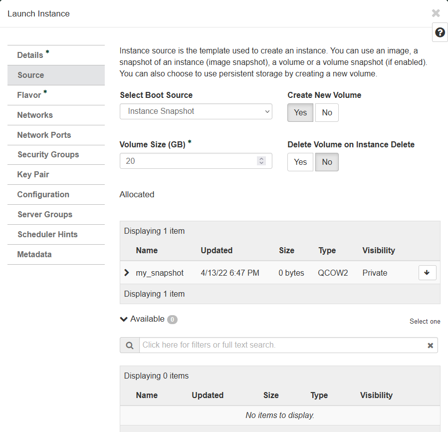 The "Available" table will change, and should contain your previously created instance snapshots.