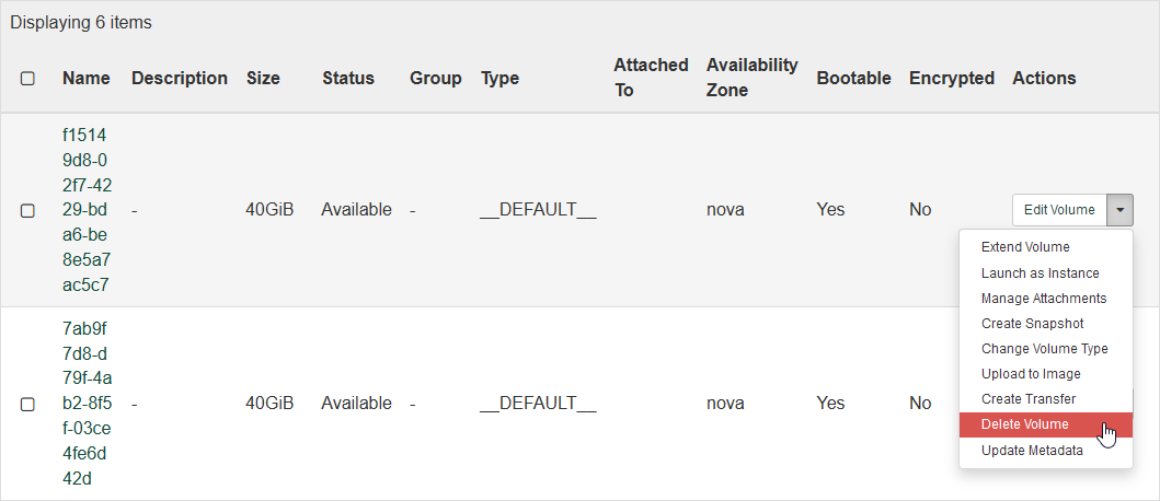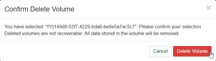 To delete a volume, return to the "Volumes" page using the left-hand navigation pane. In the table, find the row with the volume you wish to delete, and click the drop-down arrow under "Actions" in that row. Then click "Delete Volume" to open a confirmation dialog.