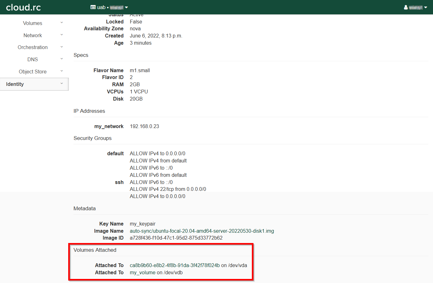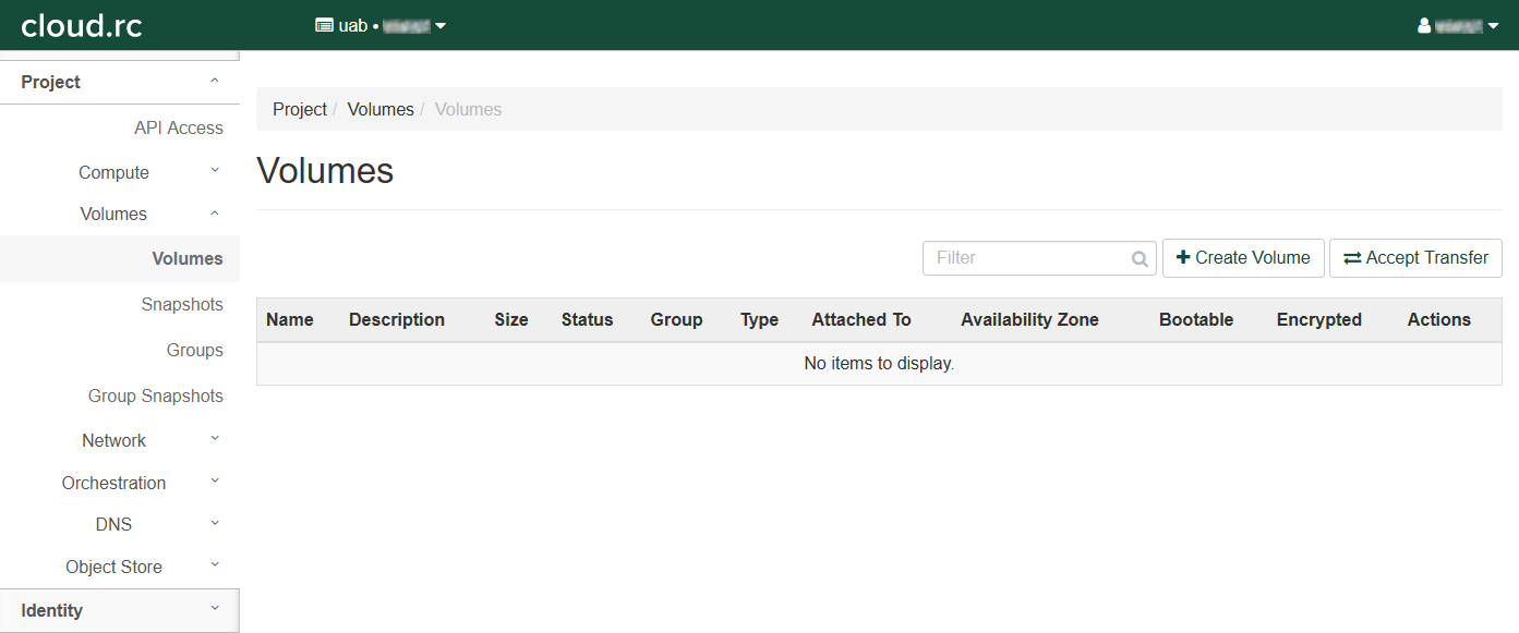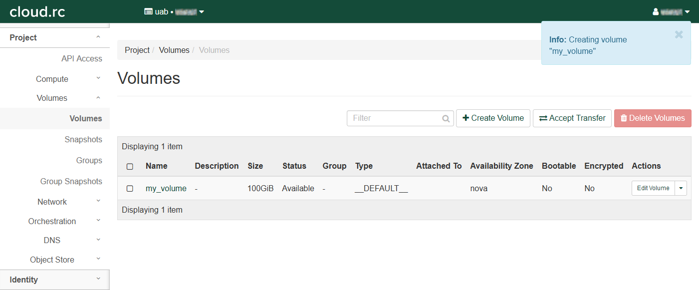 To attach a volume you must have already created at least one using the cloud.rc interface. More information can be found in [link]
