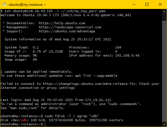 Now the volume should be attached to the instance. From here you may format the volume and mount it.