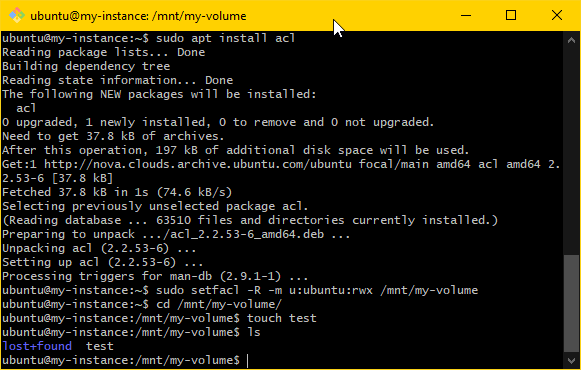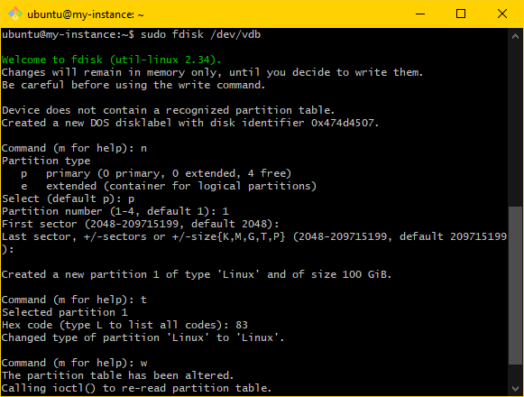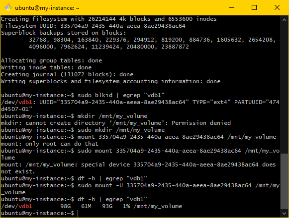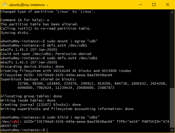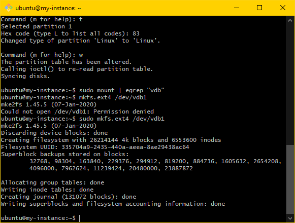 sudo mkfs.ext4 "<pmount>". Ensure that the output looks like the following:ubuntu@my-instance:~$ sudo mkfs.ext4 /dev/vdb1 mke2fs 1.45.5 (07-Jan-2020) Discarding device blocks: done Creating filesystem with 26214144 4k blocks and 6553600 inodes Filesystem UUID: 335704a9-2435-440a-aeea-8ae29438ac64 Superblock backups stored on blocks: 32768, 98304, 163840, 229376, 294912, 819200, 884736, 1605632, 654208, 4096000, 7962624, 11239424, 20480000, 23887872 Allocating group tables: done Writing inode tables: done Creating journal (131072 blocks): done Writing superblocks and filesystem accounting information: done