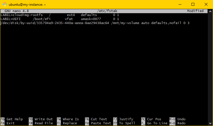 fstabfile to make mounting persistent across instance reboots.- Edit the file using