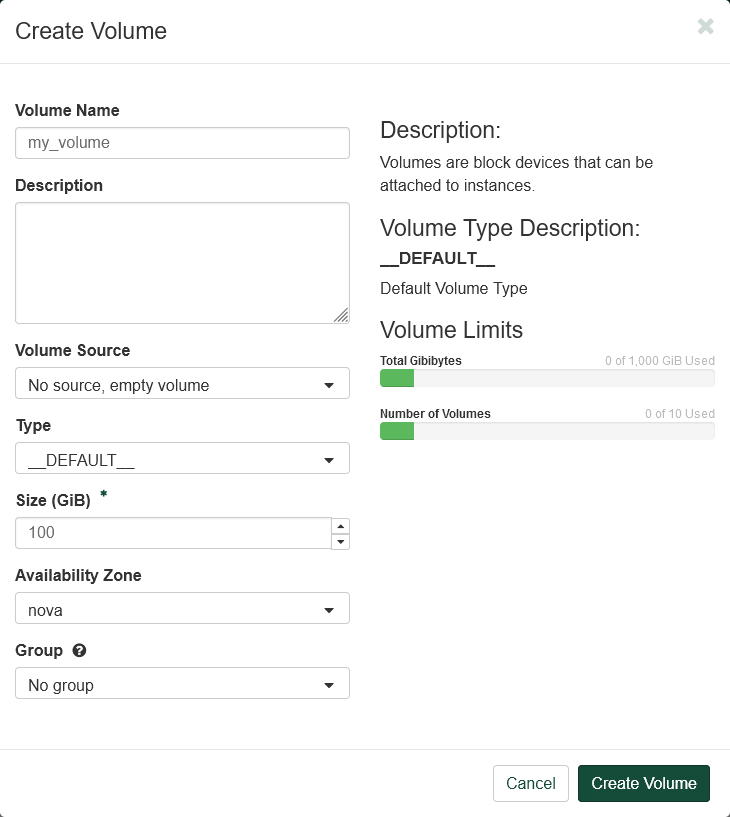 Click "+ Create Volume" to open a dialog box.