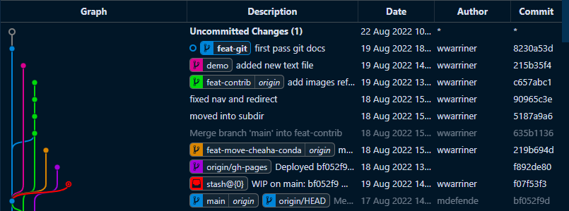 Each row is a single commit, or set of changes. The vertical threads in the "Graph" column are branches which can be seen to fork and merge with one another. Each branch tip is labeled with the branch name under the "Description" column, along with a message describing the commit. The "Date" column shows when a commit was made, "Author" by whom, and "Commit" a partial hash that uniquely identifies the commit.