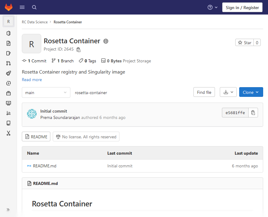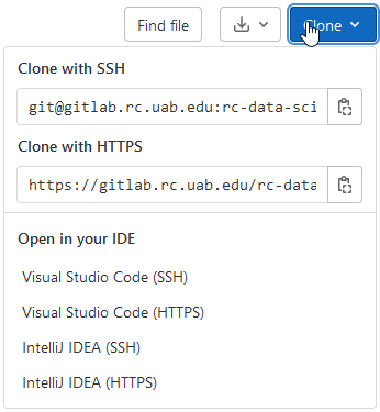 To clone a repository, be sure you have the repository URL. Then, using git at a terminal, clone the repository using whatever settings are appropriate. Be sure to append .git to the end of the repository or the clone will note be successful. For example, if the URL is https://gitlab.rc.uab.edu/user/repository then you will clone https://gitlab.rc.uab.edu/user/repository.git. GitLab repository pages look like the example shown below.