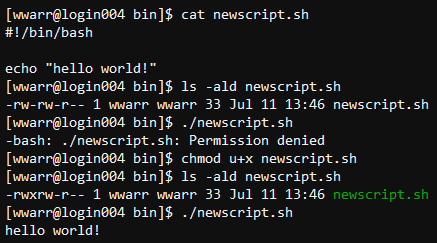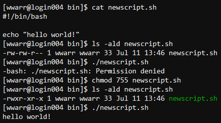 chmodused numerically to add execution permissions to all users. Note the error before permissions are set.