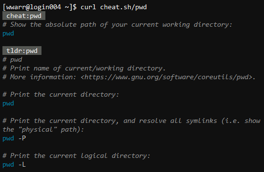 At the shell prompt, you can also use the command curl cheat.sh/<command> to get a simple-to-understand explanation of what the command does and how to use it (see curl). Below is an example for the pwd command.