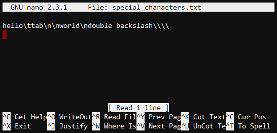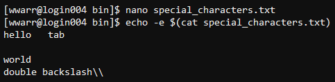 Below is an example file containing escaped characters (shown in nano), and its interpreted output (shown with echo).