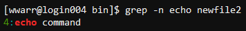 Below is an example of grep -n on a file. The number at the start of the result line is the line number of the pattern match. The matched portion is shown in red while other text on the same line is shown in white. The file was created by redirecting the echo command to a file, using the special newline character to add line breaks. We are looking for the literal text "echo" within the file.