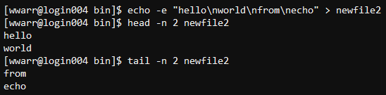 Below is an image showing the use of head and tail on a file with four lines. The file was created by redirecting the echo command to a file, using the special newline character to add line breaks.