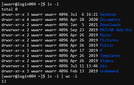 Commands may be composed into chains using pipes with the pipe character |. For example, ls -l | wc -l counts the number of lines returned by ls -l (see ls and wc). Warning This construct does not accurately count the number of items in a directory, and is only for demonstration purposes. Do not use this exact command chain in practice.