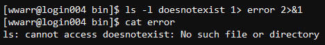 ls -l doesnotexist 1> error 2>&1stores the error message to the fileerror. The text2>&1means writeSTDERRtoSTDOUT. -