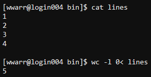 wc -l 0< linesreads the contents of filelinesand counts the number of lines. Note that forwcthis is not needed, but may be needed for other commands. In this case using<is the same as0<.