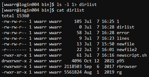 ls -l 1> dirliststores the directory listing to the filedirlist. In this case using>is the same as1>. -