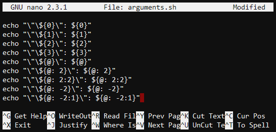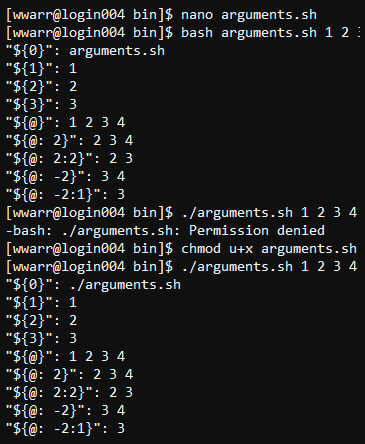 Below is an example script file, hash-bang not shown, demonstrating how each argument variable works, and its interpreted output. The text editor nano is used to display the file and chmod is used to modify file permissions.