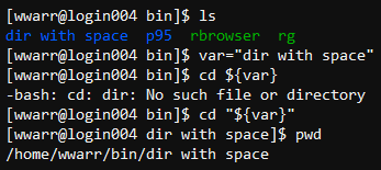 "${HOME}", do NOT use${HOME}. Double quotes ensure that space characters in expanded values are handled appropriately. Below, note the error occurring without double quotes due to the spaces in the directory name. Double quoting the variable fixes the error. The commands used to test are ls, cd and pwd. -