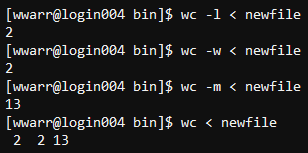 Below are example outputs of a file named newfile containing the text hello world followed by a blank line. Note the file is redirected to wc from STDIN.